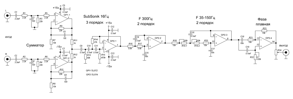 Блок обработки сигнала Поскольку усилитель для сабвуфера, сигнал который на него поступает нужно сначала обработать, вырезав только НЧ составляющие звукового сигнала. Схема устройства приведена ниже.