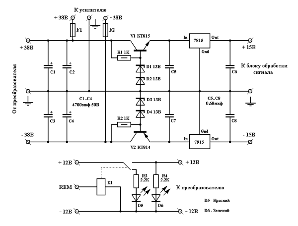 Блок коммутации и выпрямителя Блок состоит из двух отделенных частей, блока коммутации, и блока выпрямителя, в который входят фильтрующие конденсаторы для питания усилителя мощности и стабилизатор напряжения для питания блока обработки сигнала. В блоке выпрямителя все просто. Напряжение от преобразователя попадает на фильтрующие конденсаторы, сглаживается и идет к усилителю мощности, а также на стабилизатор напряжения. Транзисторы понижают напряжение к +-26В после чего кренки стабилизируют его до 15. Нагревание транзисторов или кренок я не наблюдал, потому на радиатор не ставил. Блок коммутации работает следующим образом: когда на крайные по схеме клеммы подается напряжение 12В (силовые линии) зажигаеться красный светодиод, напряжение на преобразователь напряжения не поступает, усилитель не использует энергию. Когда от внешнего источника (от автомагнитолы или замка) подается +12В на клемму REM срабатывает реле, отключая красный диод, при этом подается напряжение на преобразователь и загорается зеленый светодиод, усилитель готов к работе. Реле на 12В, что выдерживает на клеммах ключей ток в 30А, резисторы 0,125Вт.