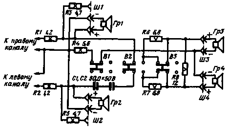 Выбор режима работы установки (стереофония или псевдоквадрафония) производится кнопочным переключателем В2. Переключателем В3 изменяют уровень сигнала на дополнительных головках. В левом, по схеме, положении переключателя В1 головки Гр3 и Гр4 кроме разностного сигнала излучают часть основного сигнала, а в правом положении - только разностный сигнал.
